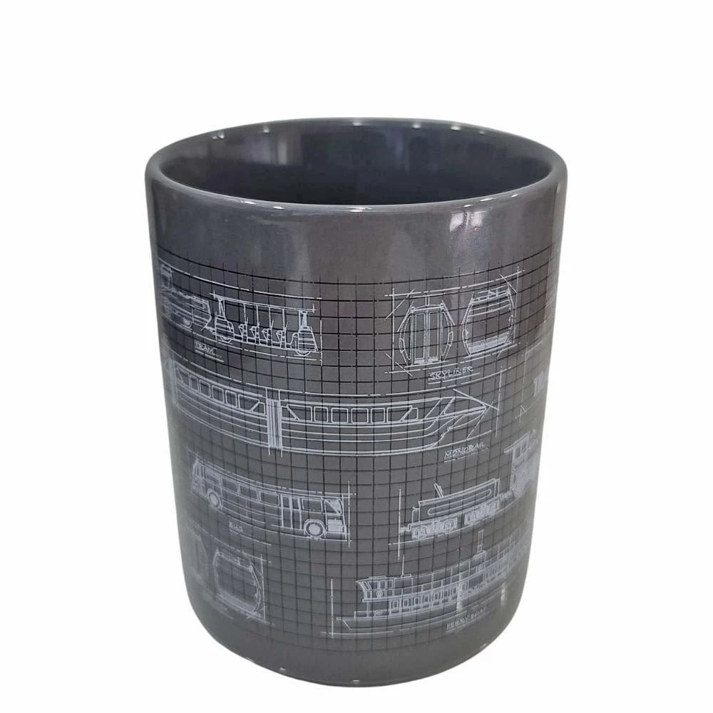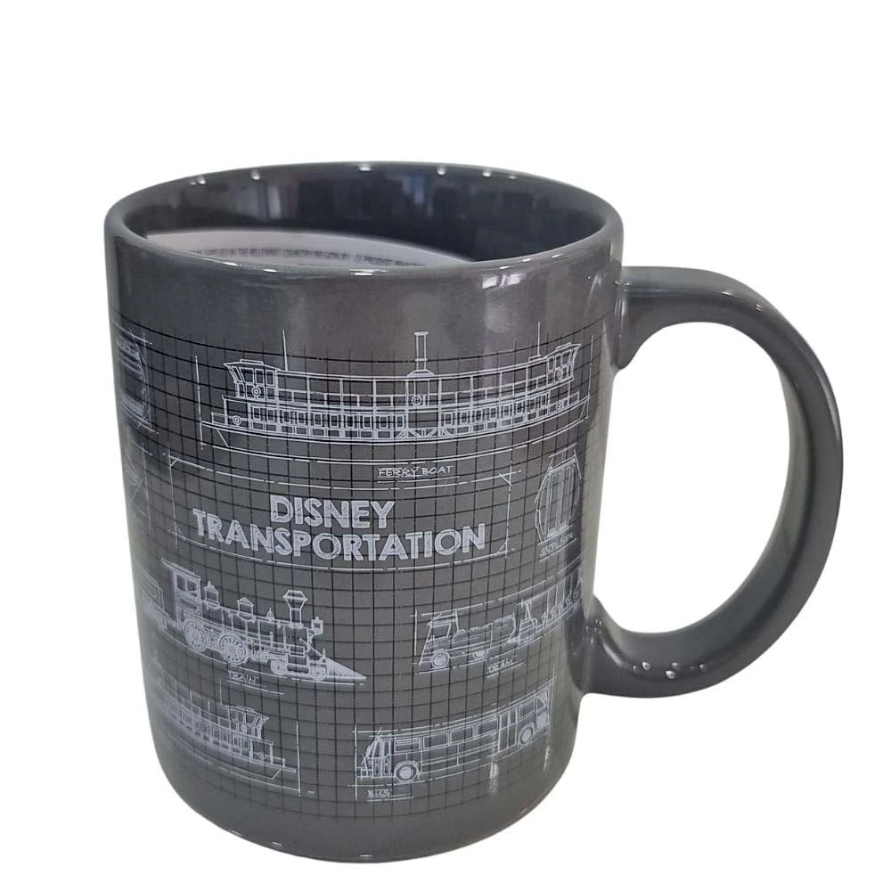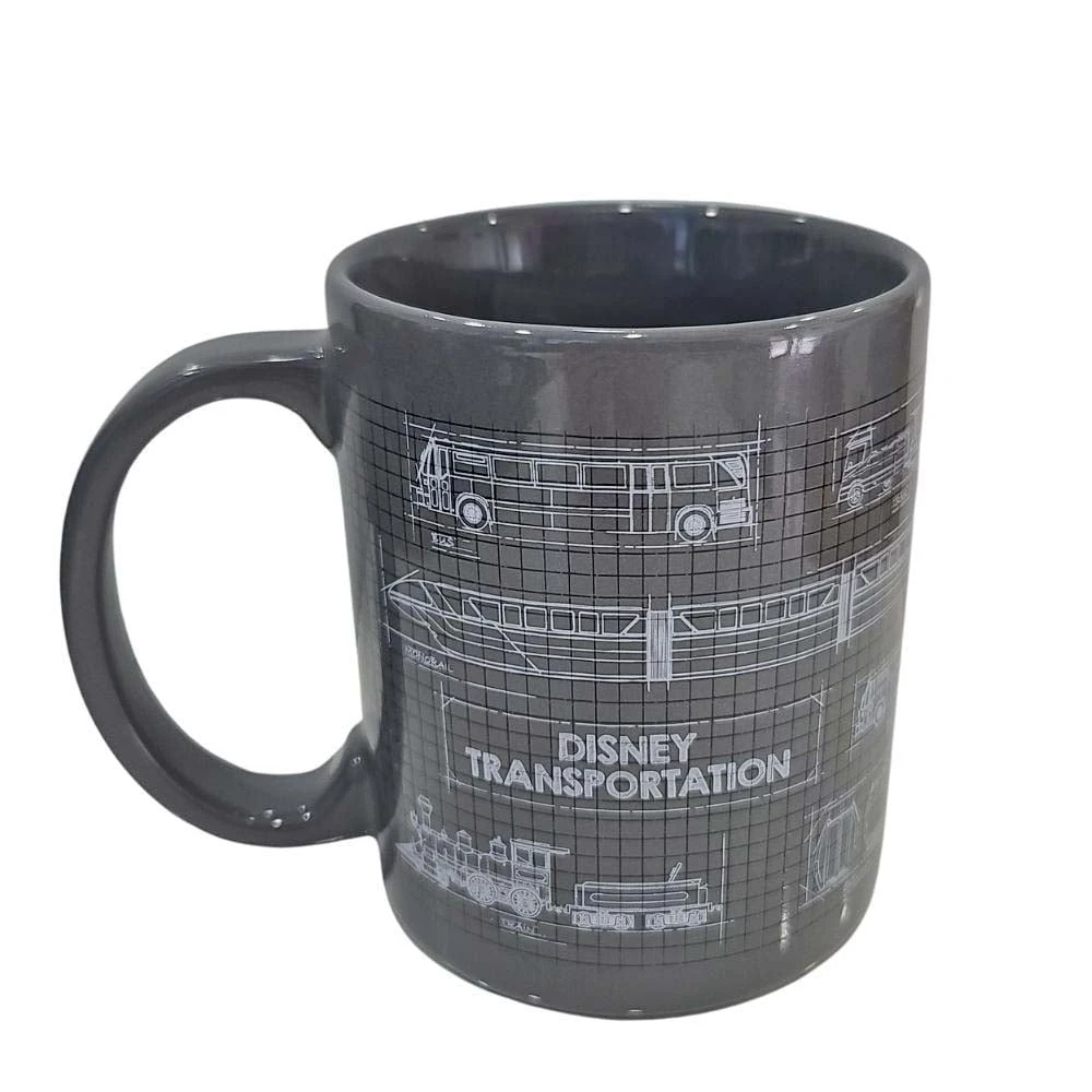 Engineering sketches of the most popular modes of Disney Transportation on a grid decorate this mug, perfect for fans and collectors of Disney buses, trains, monorails, boats, trams, and skyliner toys who will find them familiar as these same sketches decorate the packaging of those figures.