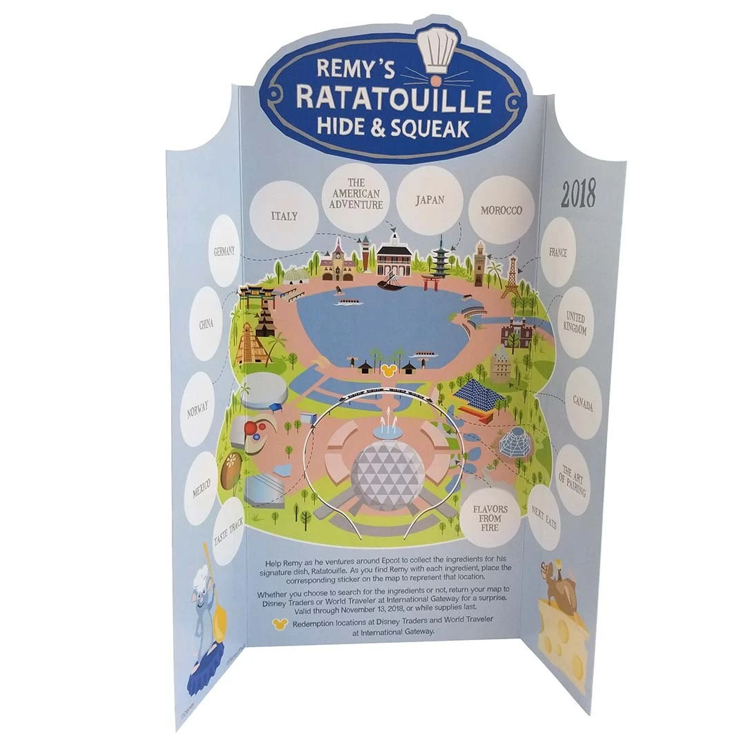 Ratatouille Remy’s Hide and Squeek scavenger hunt has returned to the 2018 Epcot International Food and Wine Festival. Get the lenticular cup prize with completed map.