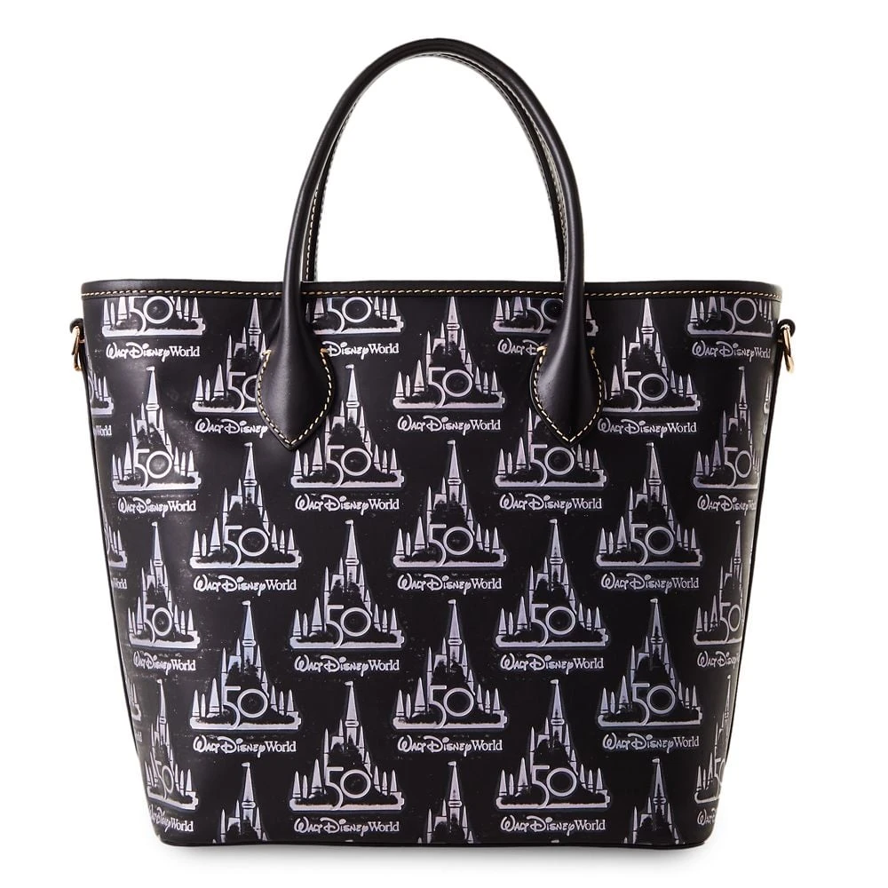 Join in The World’s Most Magical Celebration while carrying around happy memories of all your trips to Walt Disney World with this Dooney & Bourke tote bag. Fashioned in elegant black leather, it features an allover print commemorating the Park’s 50th anniversary, including a special hang tag.