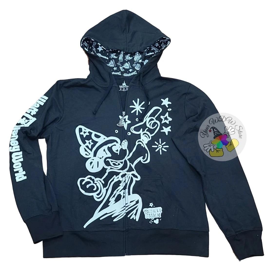 Cozy-up on cool nights at The Magic Kingdom wearing this warm hooded sweat jacket with graphics featuring Mickey as The Sorcerer’s Apprentice plus flocked artwork!