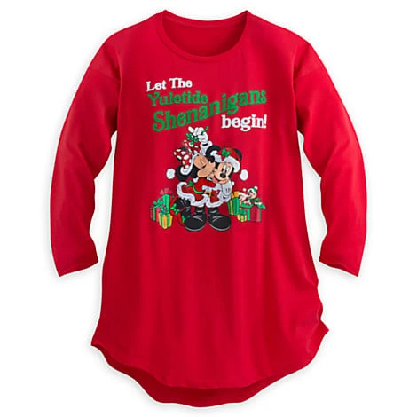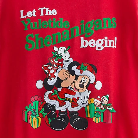 Santa Mickey gets a Christmas kiss under the mistletoe from Santa Minnie in this festive sleepshirt. With those mischievous ‘munks Chip ‘n Dale on hand, it’s clearly time to ”Let the Yuletide Shenanigans begin!”
