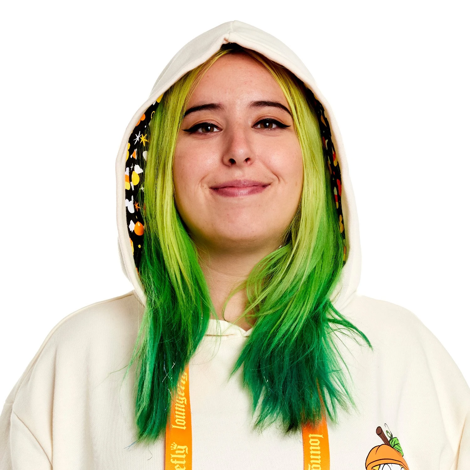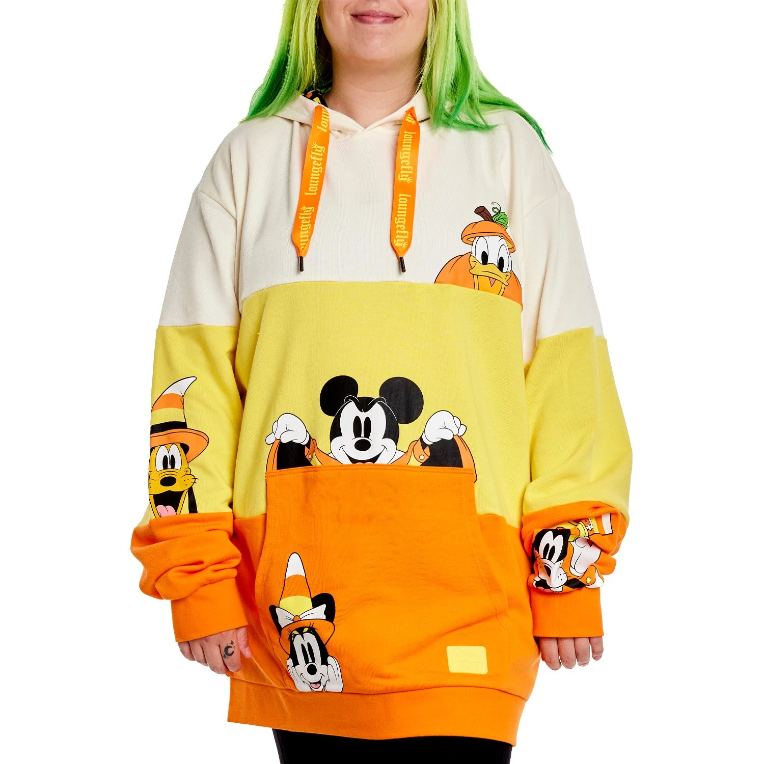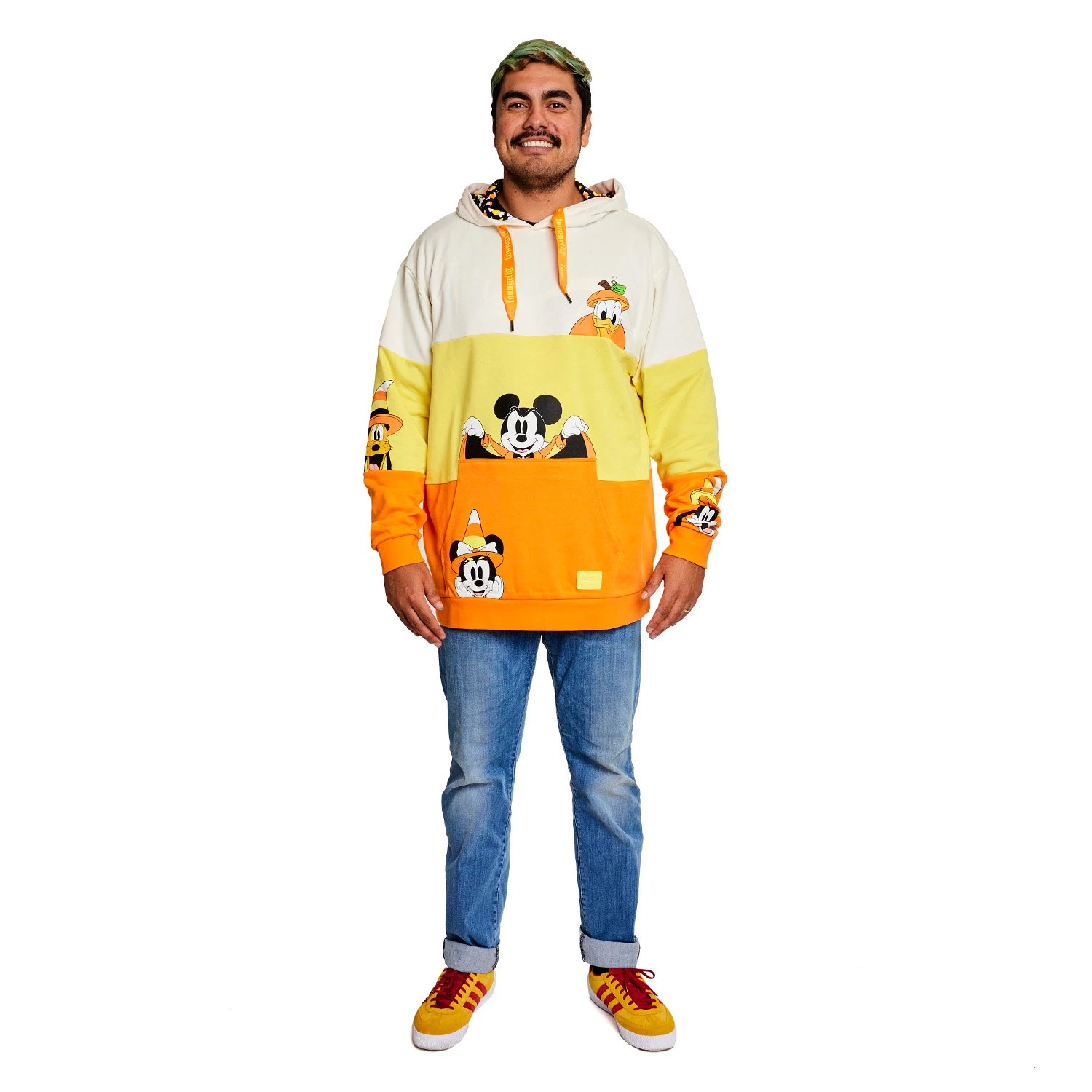 The Loungefly Disney Mickey Mouse and Friends Candy Corn Hoodie is made of French terry fabric (60% cotton, 40% polyester). Additional features include an extra-large, lanyard-style drawcord and a lined jersey hood.