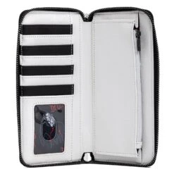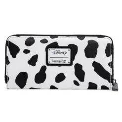 The Disney Cruella de Vil Cosplay Zip Around Wallet is made of faux leather, has a zip around closure, sturdy metal hardware, matching themed lining, and features; embroidered, debossed, and printed details.