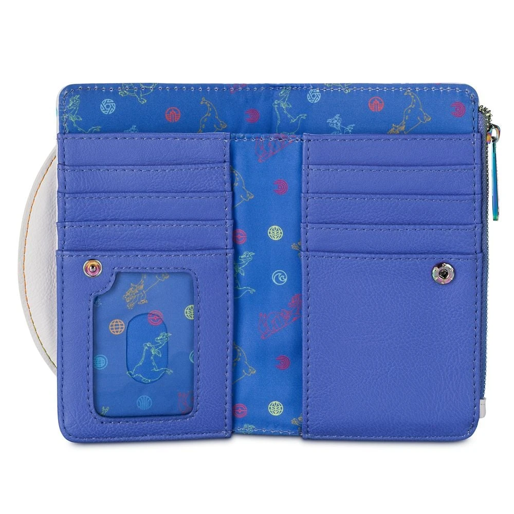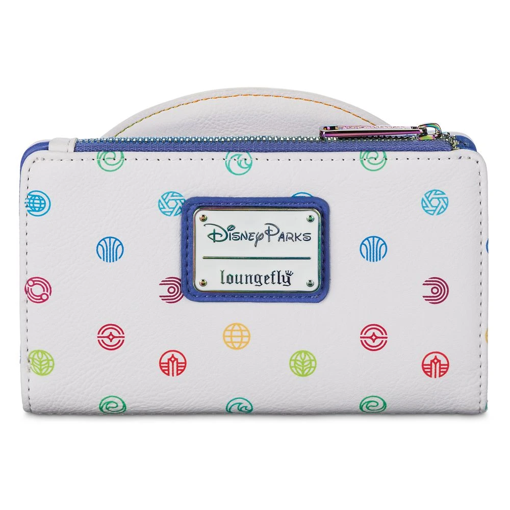 Celebrate the 40th Anniversary of EPCOT with this colorful wallet by Loungefly. With an allover colorful print of attraction icons from the park and an ”EPCOT40” rainbow appliqué on a 3D Spaceship Earth front pocket, it makes a wonderful and functional souvenir of the anniversary.