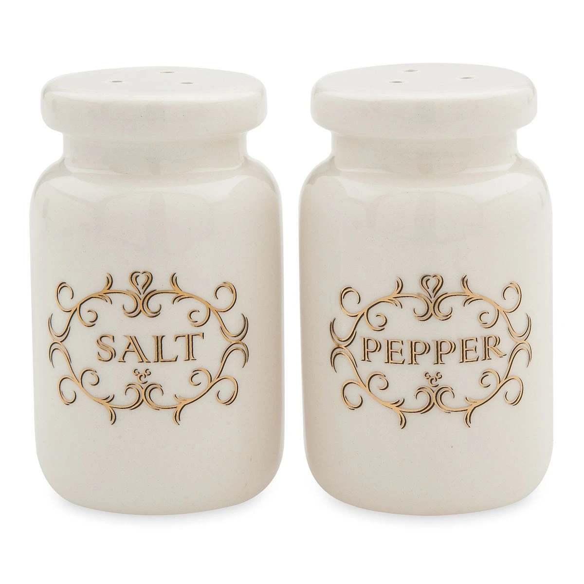 - Back of bottles featuring gold foil screen text of ”Salt” and ”Pepper”