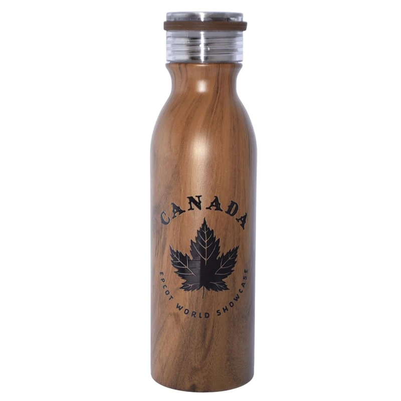 Mickey and his pals Goofy, Donald, and Chip n’ Dale pose like a totem pole on this water bottle from Canada at Epcot World Showcase.