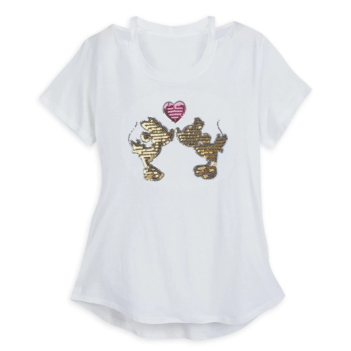 There’s sparkle aplenty on this upscale tee from the Chic Out the Parks Collection. Mickey and Minnie’s silhouettes are sewn in shimmering sequins, while a high-low hem and shoulder/neckline keyholes provide a fresh new look.