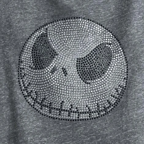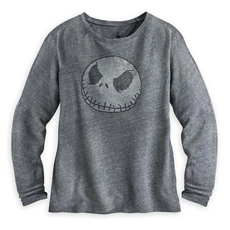 Follow the light to the peaceful bliss of Jack Skellington’s long sleeve tee for women. Soft heathered knit fabric presents a portrait of the Pumpkin King in shiny faceted studs.