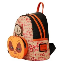 Sharpen your look with a sweet accessory. Our Loungefly Trick ‘r Treat Pumpkin Mini Backpack is ready for some fun. On the front of this backpack, a devilish-looking pumpkin doubles as a front-zipped pocket. Sam pops up over the pumpkin, and he’s holding a half-eaten jack-o’-lantern lollipop. Behind him, “dripping” red letters spell out, “Trick or treat. Give me something good to eat” in a motif. A silicone charm of a candy bar with a knife blade sticking out completes the look. On the back, you’ll find a flaming pumpkin, and the orange and black color theme carries over as stripes on the shoulder straps. Carry along just what you need to enforce the rules of Halloween in style—or simply visit your favorite haunts in character.