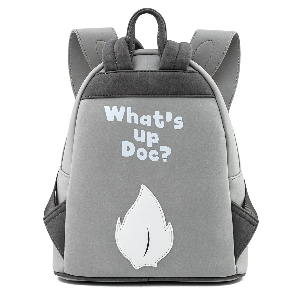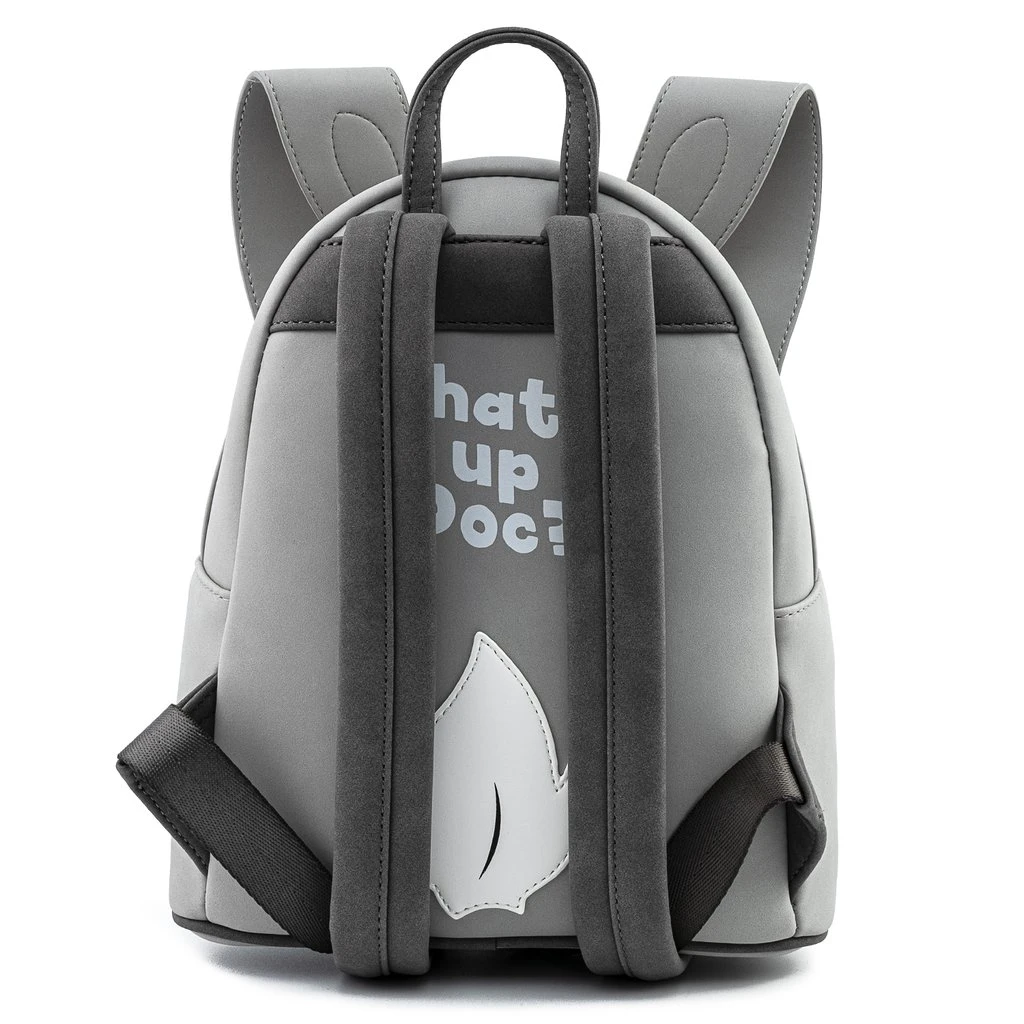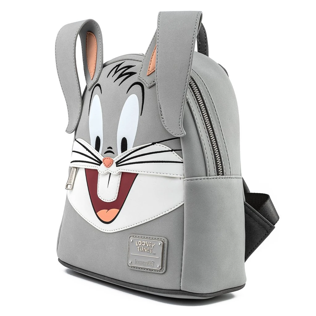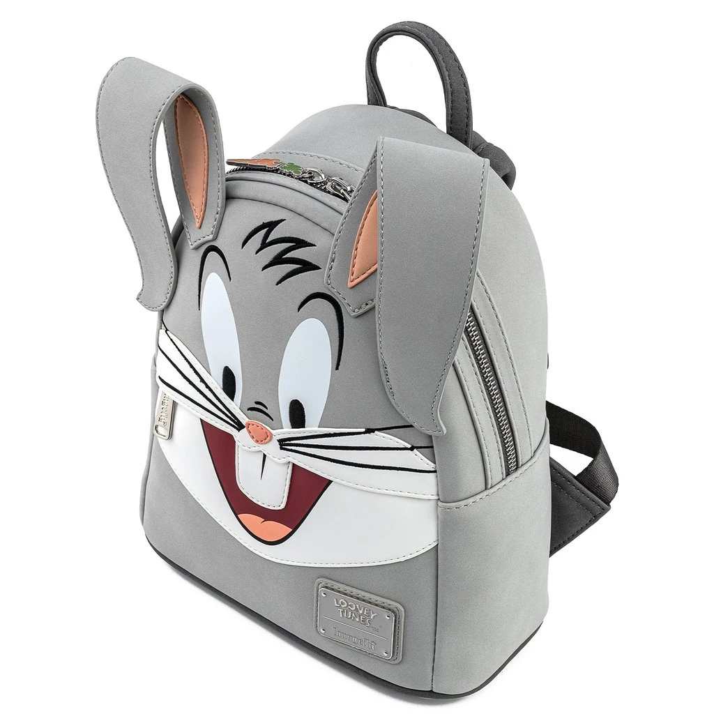 - The Looney Tunes Bugs Bunny Cosplay Mini Backpack is made of faux suede with vegan leather (polyurethane) trim. Bag has adjustable shoulder straps, sturdy metal hardware, and features: applique, printed, and enamel zipper charm details. Take note of the coordinating design of the inside lining fabric.