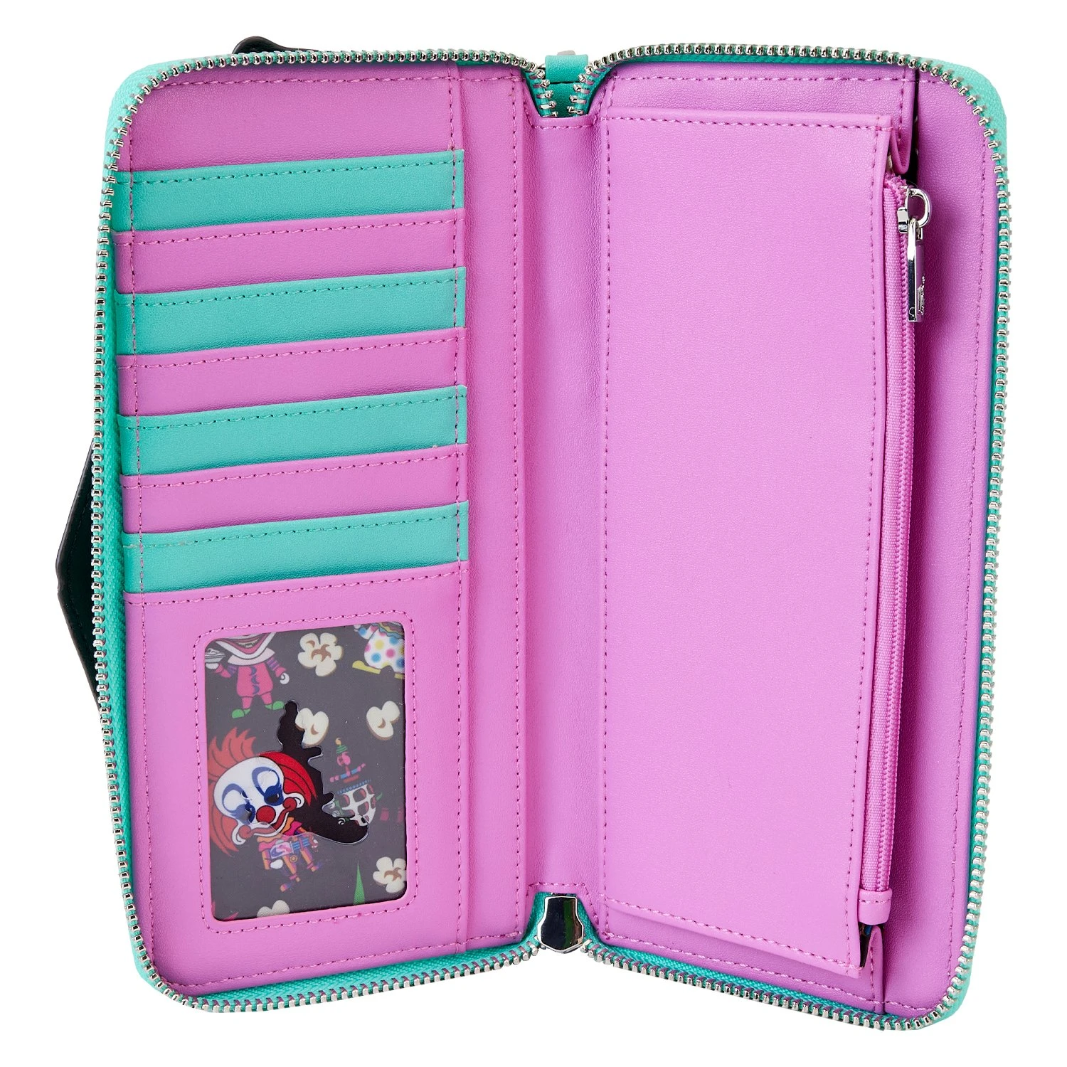 When the circus comes to Crescent Cove, arrive in killer style. Bring along our Loungefly MGM Studios’ Killer Klowns from Outer Space Wristlet Zip-Around Wallet. Get ready for some out-of-this-world adventures with an accessory packed with fun details. Applique features bring the “Crazy House” to life. A grinning clown face, with its jaws open wide, greets whoever might approach the door between its teeth. In the dark, distinct features of the “Crazy House” and the clown’s face glow! On the back, your favorite creepy Killer Klown characters appear, including Rudy, Shorty, Fatso, Slim, and Bibbo. They’re all holding pies, and the words, “What are you doing with those pies, boys?” materialize in white letters. Inside, you’ll find 8 slots for holding cards and 1 clear slot for displaying your ID. A die-cut shape of a Killer Klown adds a wickedly wonderful surprise. An extra zipped compartment also adds plenty of room for securing valuables. Get in on the act and celebrate the 35th anniversary of this classic sci-fi film.