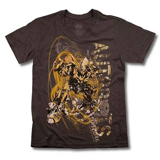 Swirling motion hums around Bumblebee in this high energy image featured on a charcoal t-shirt. Gold-colored foil treatment details add a metallic-like appearance to the screen-print image. Adult shirt has v-neck for a finished look.