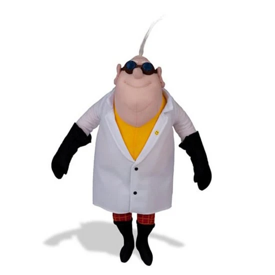 You can almost see great scientific genius at work here. This Dr. Nefario plush doll with small whisp of hair comes equipped in signature lab gloves and goggles and lab coat complete with smiley face on left lapel.
