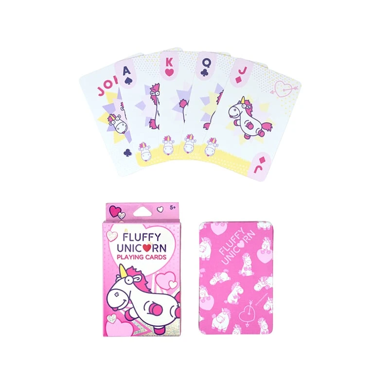 Pass the time with friends with this full 54-card deck, including two jokers. Card faces have adorable images of Fluffy the Unicorn in fun stylized poses, and patterned print on the back.